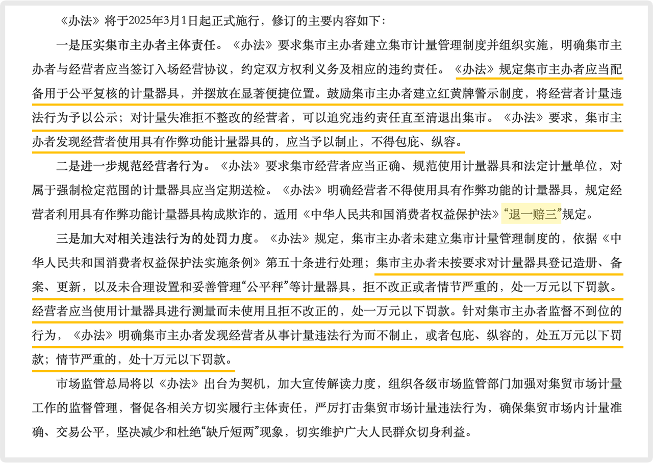 ○ 2025年3月1日:新版《集貿市場計量監督管理辦法》施行。其中核心變化之一是全面壓實了市場主辦方的管理主體責任。要求其建立計量管理制度、對場內秤具登記備案,并有責任制止并不得包庇計量作弊行為,否則將面臨高額罰款。這些規定從市場管理源頭建立了防線,促使市場主動加強對合規電子計價秤的監督與采用。