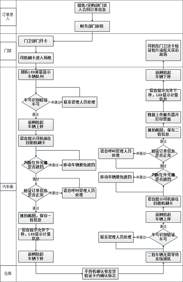 按功能性劃分,主要由以下幾個小系統組成:合同管理系統(包括采購合同,銷售合同,運費合同等),門禁系統,排隊系統,無人值守稱重系統,倉庫存儲系統,PDA手持終端收發貨管理,財務管理系統,結算系統等。
